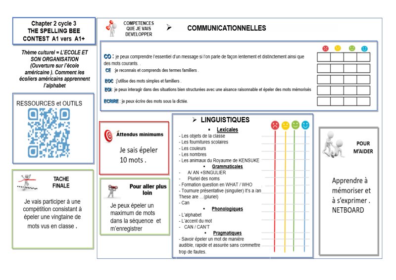 - COMMUNICATIONNELS =savoir se présenter brièvement et épeler des mots.